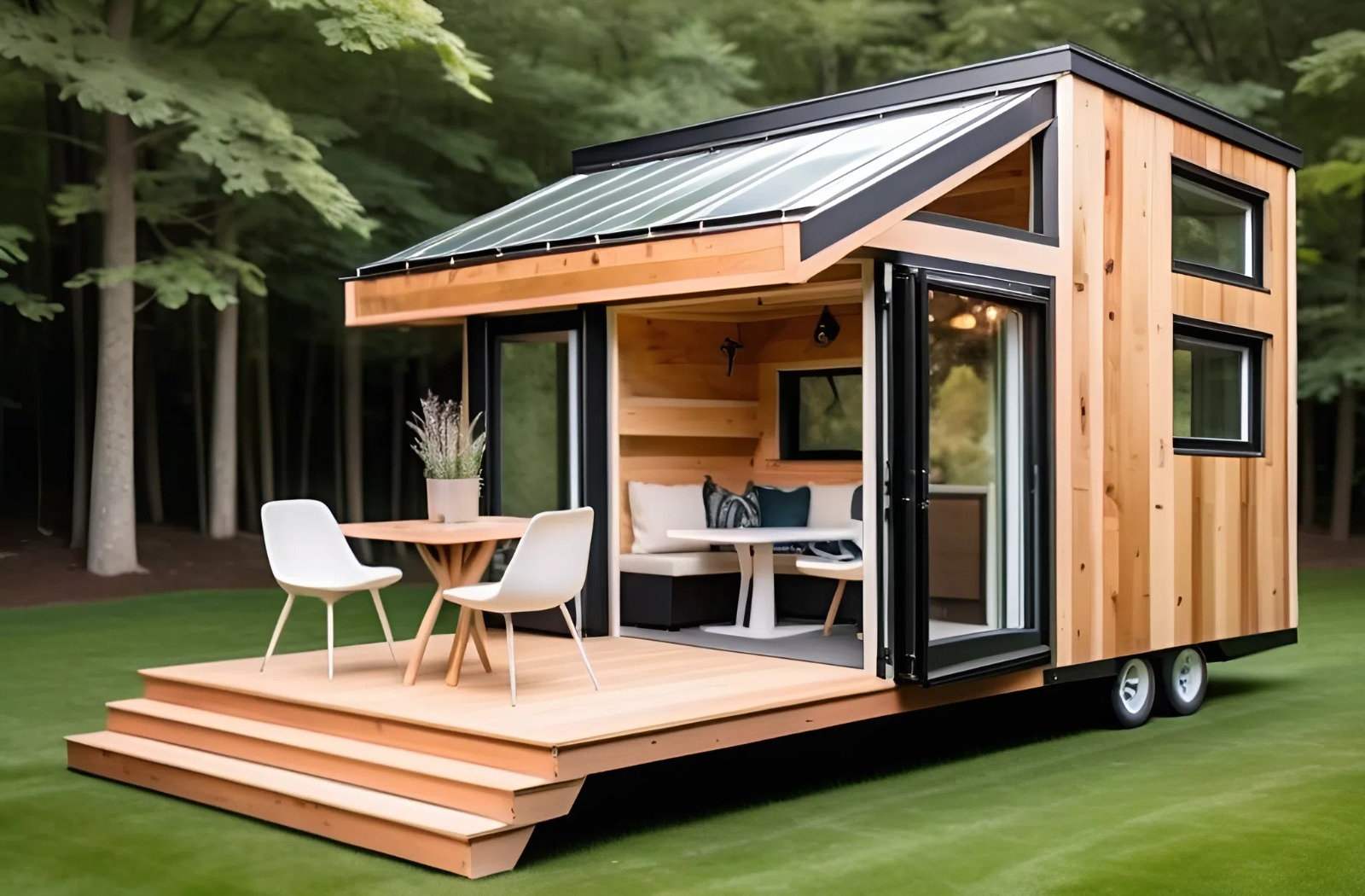 Se la tua casa minuscola è mobile o ha accesso all'esterno, crea una connessione senza soluzione di continuità con una piccola terrazza o mobili da esterno pieghevoli. Questo estende il tuo spazio abitativo e fa sembrare la tua casa più ampia.
