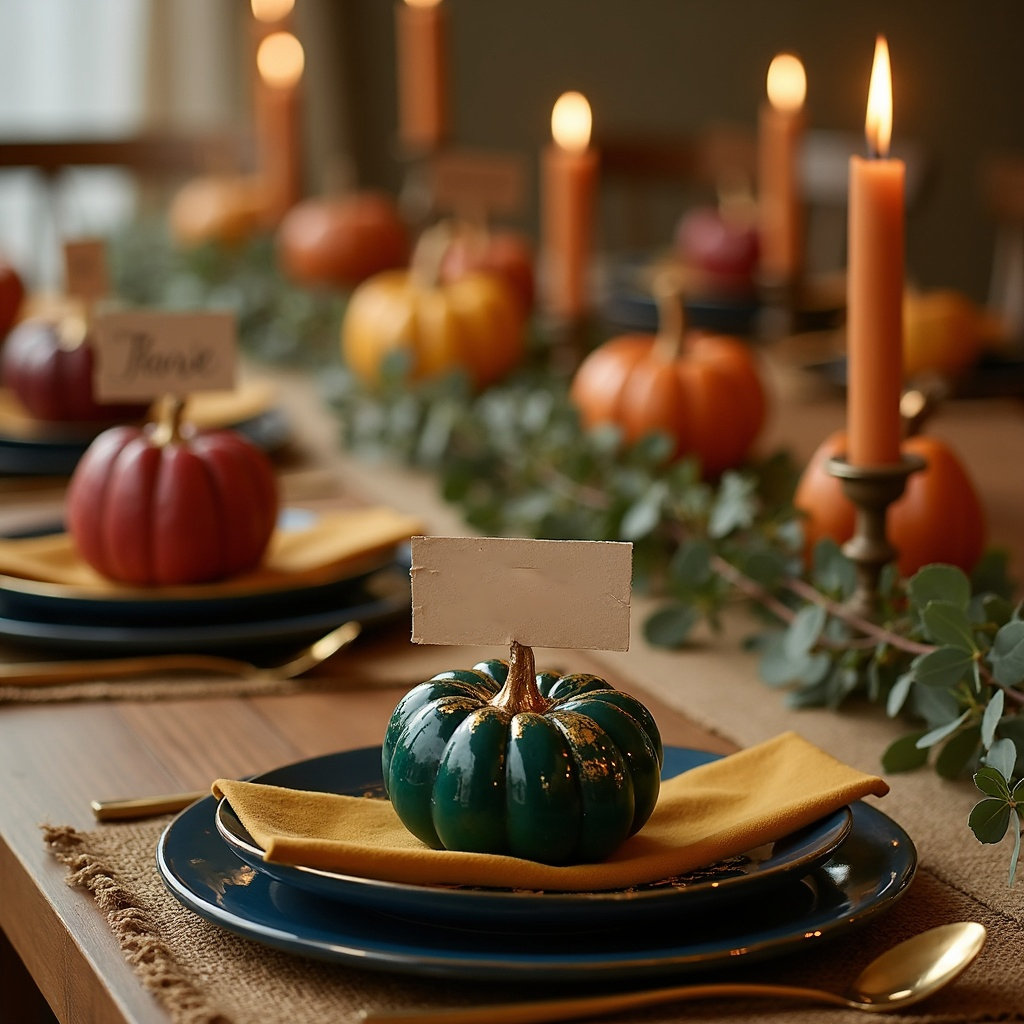 Immagina la tua tavola illuminata da mini zucche dipinte in tonalità profonde di smeraldo e rubino, con i bordi immersi in un oro scintillante, ognuna delle quali contiene un bigliettino con il nome degli ospiti. Non è solo un segnaposto, ma una vera e propria dichiarazione di stile. I toni gioiello, vibranti ed eleganti, elevano la decorazione rustica del Ringraziamento al di là dei classici arancioni e marroni.