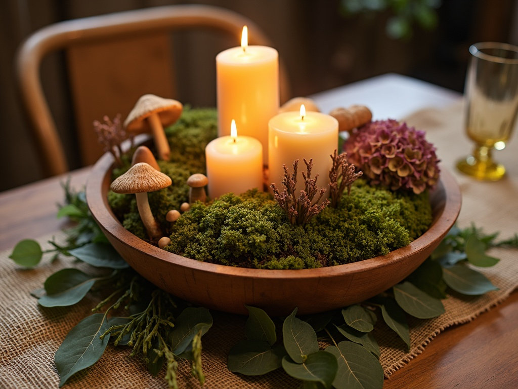 - Istruzioni: disponi il muschio alla base della ciotola, quindi aggiungi le ortensie e i funghi per creare consistenza. Inserisci 3-4 candele a LED (a batteria per la sicurezza) tra gli elementi. Aggiungi rametti o pigne raccolti per un tocco gratuito.